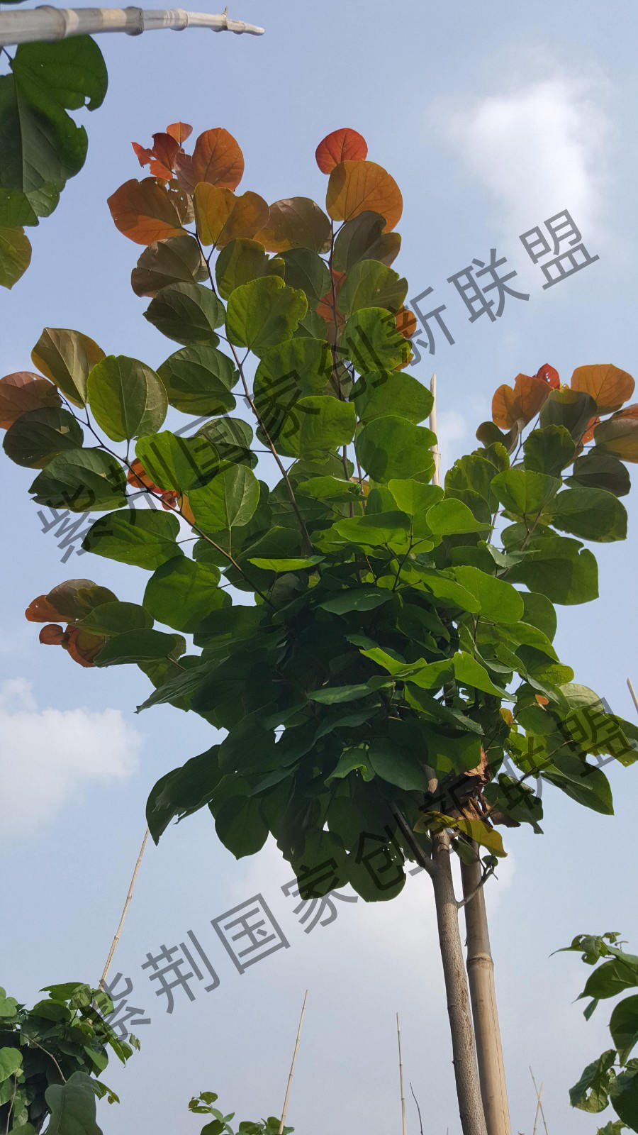 ‘鴻運(yùn)當(dāng)頭’紫荊樹為‘四季春1號(hào)’紫荊樹的實(shí)生選育品種,當(dāng)年生枝上皮孔較少,幼枝顏色為棕紅色;幼葉淡紫紅色至棕橙色,葉片頂部鈍圓,主脈顏色為紅色。