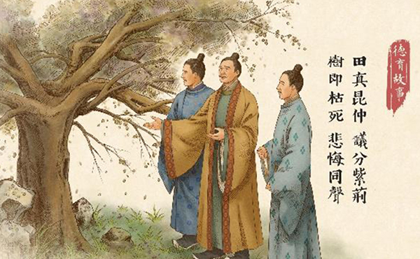 京兆田真兄弟三人,共議分財(cái)。生資皆平均,惟堂前一株紫荊樹,共議欲破三片。明日,就截之,其樹即枯死,狀如火然。真往見之,大驚,謂諸弟曰:“樹本同株,問將分斫,所以憔悴。是人不如木也。”因悲不自勝,不復(fù)解樹。樹應(yīng)聲榮茂,兄弟相感,合財(cái)寶,遂為孝門。真仕至太中大夫。【陸機(jī)詩云:“三荊歡同株?!薄?/p>