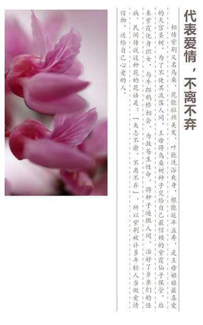 相傳紫荊又名烏桑,花能駐顏美發(fā),葉能洗浴爽身,根能延年益壽,是王母娘娘最喜愛的天宮圣樹。為了不使其流落人間,王母將烏桑樹種子交給自己最信賴的紫霞仙子保管。后來紫霞化身織女,與牛郎鵲橋相會,得知鄉(xiāng)親們得了一種怪病,人間疾苦,生靈涂炭,紫霞不忍百姓受苦,為救蒼生性命,拼死將烏桑樹種子和花偷了出來。紫霞將花瓣撒向人間,神奇的花瓣治好了鄉(xiāng)親們的怪病;又將種子交給百姓,并教會了人們栽植烏桑樹的方法。人們?yōu)榱思o(jì)念善良美麗的紫霞仙子,就將烏桑樹命名為紫荊樹,也開啟了世世代代栽種紫荊樹的習(xí)俗。