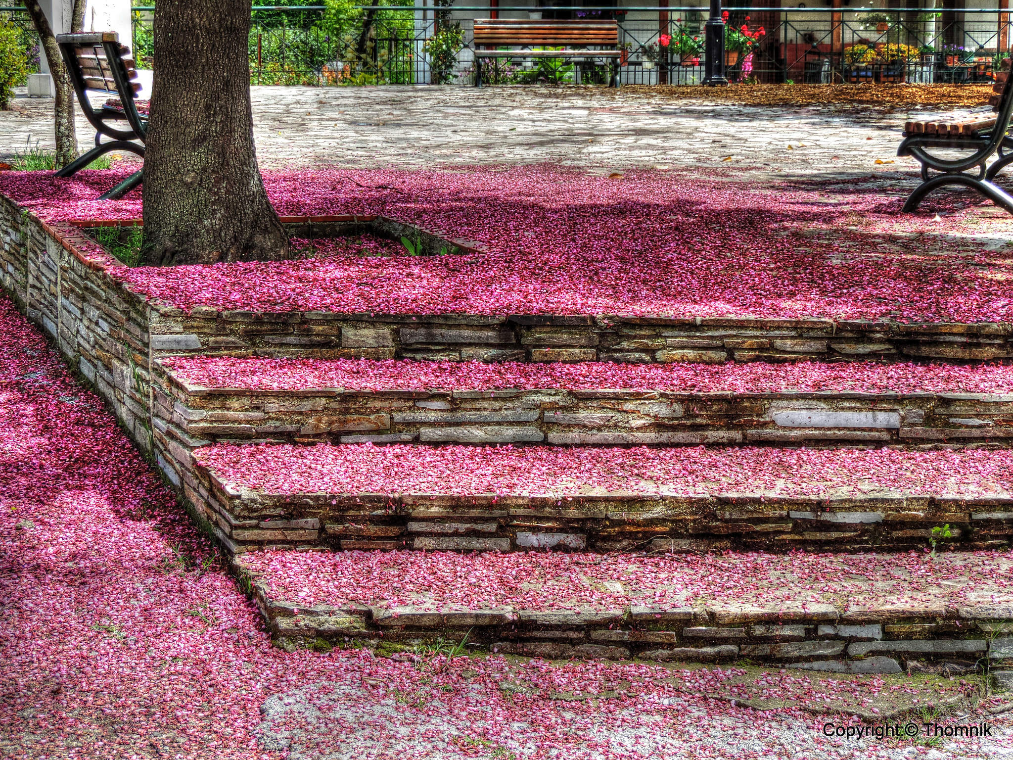 紫荊繁艷空門晝,紅藥深開古殿春。